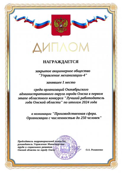 В 2003г. предприятие отмечено Почетной грамотой Администрации г.Омска. В октябре 2005г. Российский Союз строителей наградил ЗАО «УМ-4» Почетным знаком «Строительная слава», также по итогам 2005г. на международном форуме «Потенциал нации» предприятие было награждено Почетным знаком «Инженерная слава России I степени». В 2005 году ЗАО «УМ-4» внесено в реестр «Надежные организации строительного комплекса» и получило «Ревизионный сертификат» этой программы. В 2005-2007г.г. предприятие стало победителем ежегодного областного конкурса на лучшую строительную организацию среди монтажных организаций. По итогам 2006г. предприятие стало лауреатом конкурса «Лучшее предприятие ХХI века». В 2008г. ЗАО «УМ-4» стало лауреатом Всероссийского конкурса на лучшую строительную организацию и Городского конкурса «Лучшая социально ориентированная организация». В 2009 году Генеральный директор ЗАО «УМ-4» стал лауреатом Национальной ежегодной премии «Лучший руководитель года». Также он был отмечен почетным знаком «Инженерная слава России». |